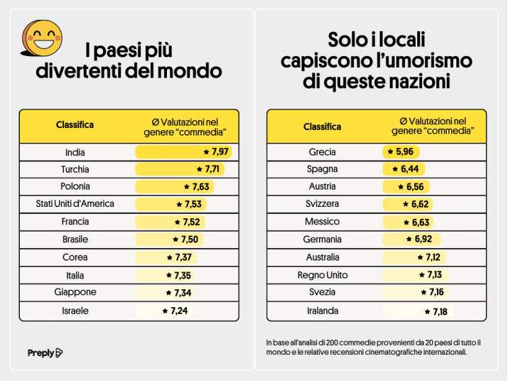 Il risultato è una classifica dei Paesi con il miglior umorismo, che non solo rivela le nazioni più divertenti, ma mostra anche che classici come lo slapstick e gli stereotipi ottengono ancora il maggior numero di risate.