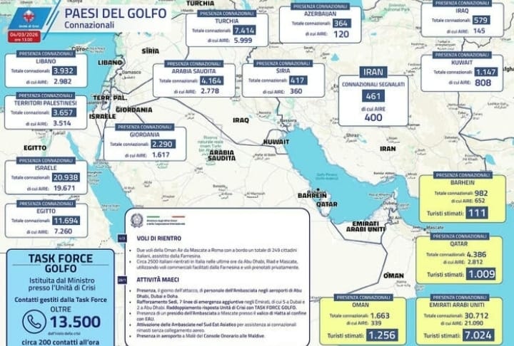 Secondo i dati ufficiali rilasciati dalla Farnesina, la macchina dei soccorsi si è mossa con volumi imponenti. La Task Force Golfo avrebbe gestito, dall’inizio della crisi, oltre 13.500 contatti. Un lavoro di monitoraggio e assistenza che il Ministero degli Esteri rivendica come prova di una presenza costante dello Stato nelle aree calde.