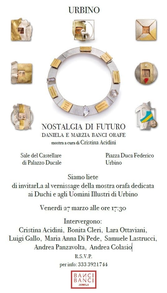 «È all’eredità culturale urbinate che la ricerca delle sorelle Banci guarda con consapevolezza critica. I loro gioielli non si limitano a tradurre iconografie in scala preziosa. Essi operano una trasposizione concettuale: la materia diventa racconto, il metallo assume densità simbolica, la pietra incastonata evoca una stratificazione di memorie. Le micro-architetture che condensano storia, filosofia e territorio. L’oro e l’argento dialogano con metalli ossidati, con superfici incise, con pietre dure che rimandano alla geografia marchigiana. È una riflessione sul presente: sulla possibilità di coniugare identità e apertura, radicamento e visione. La Nostalgia è riconoscimento di una radice feconda; il Futuro è compito culturale: un progetto politico e artistico dalle nuove prospettive». Luigi Gallo, direttore Galleria Nazionale delle Marche